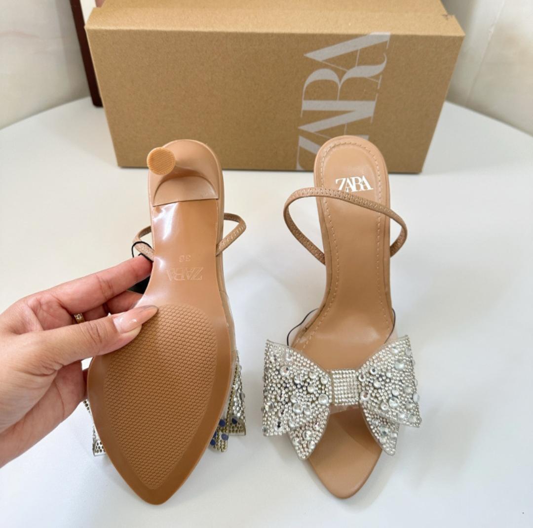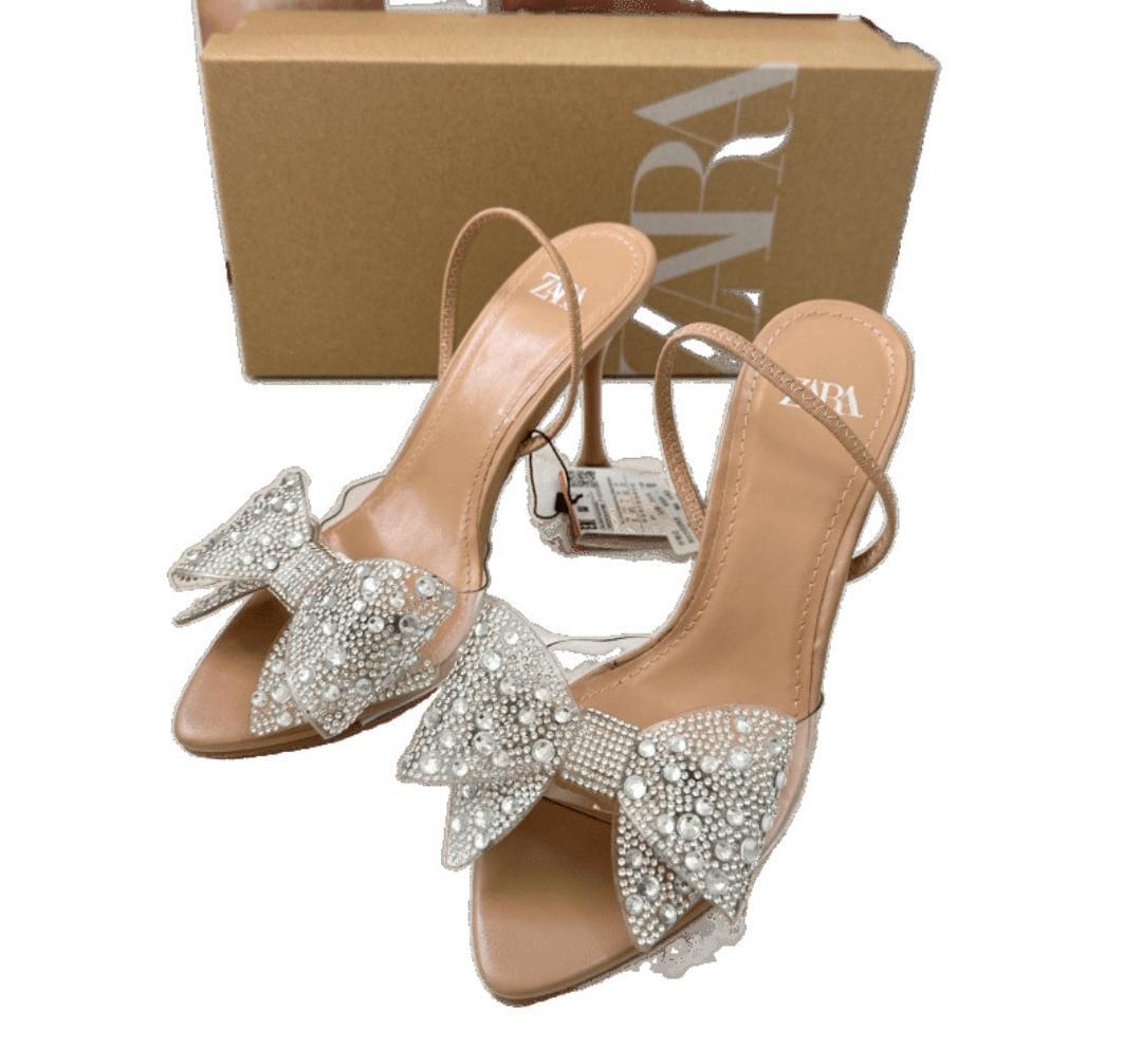 Elegant nude heeled sandals featuring pearl and rhinestone-embellished bows, designed by ZARA.