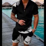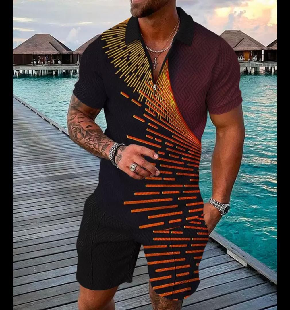 Ignite your summer style with a bold, geometric design that captures the energy of a coastal sunset. This deep burgundy and black set features striking orange rays, perfect for making a powerful impression at any evening beach event