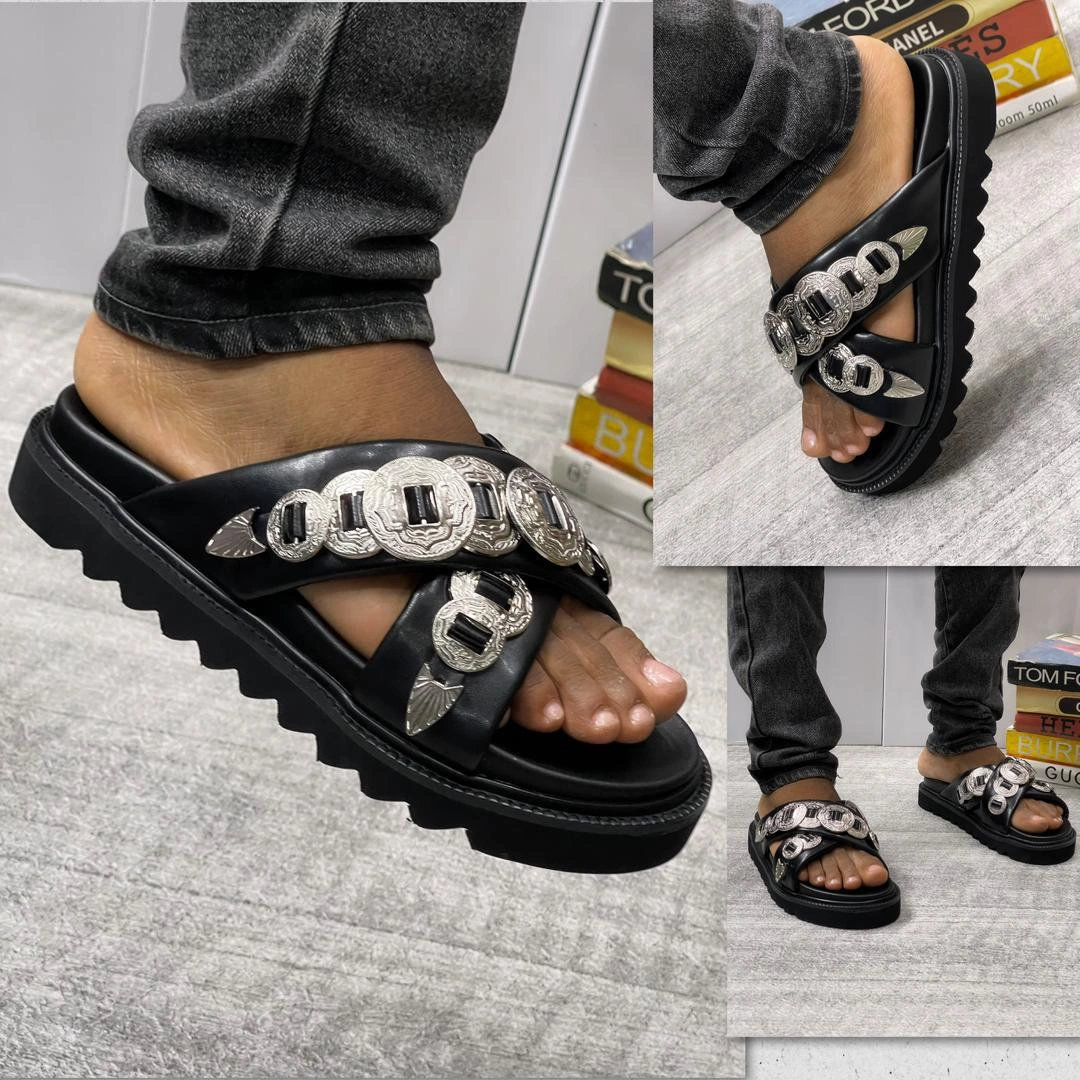 Make a bold statement with these avant-garde Toga Virilis-inspired slides featuring intricate silver-tone metal hardware. The striking Western-style embellishments on a classic black leather base create a look that is both rebellious and high-fashion.